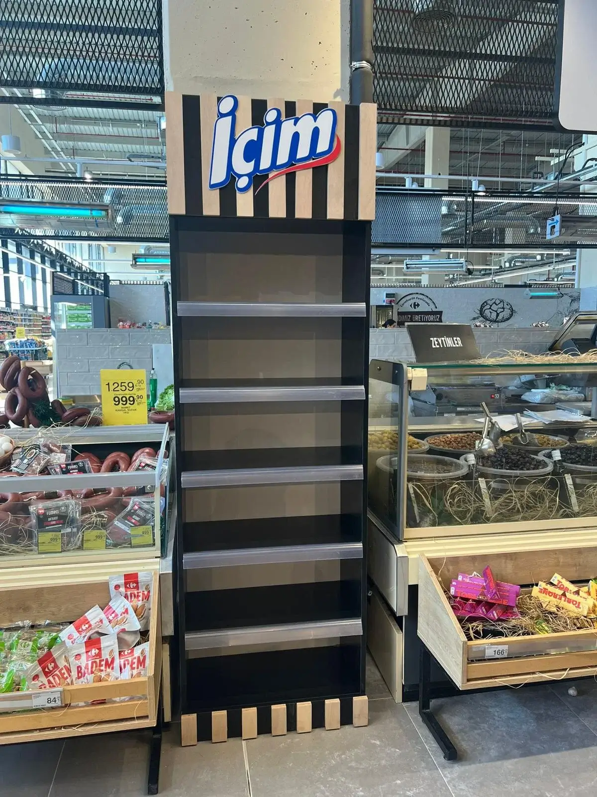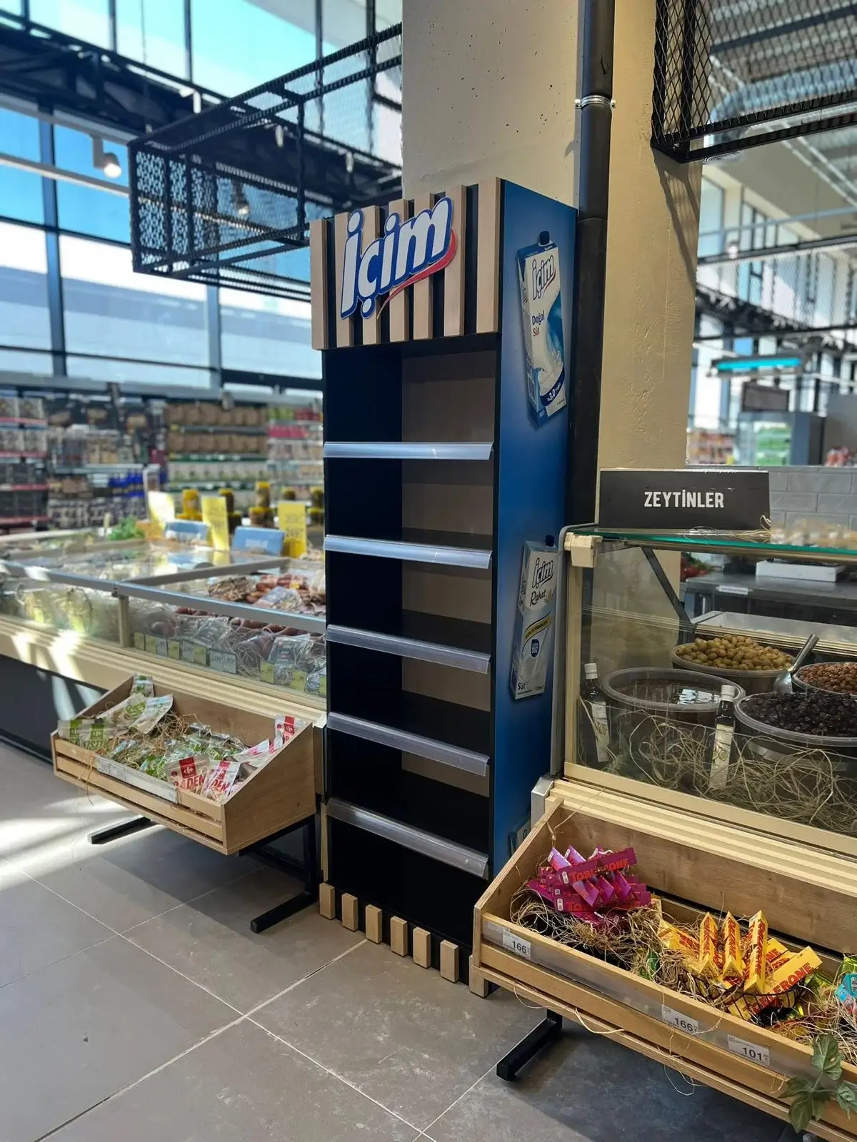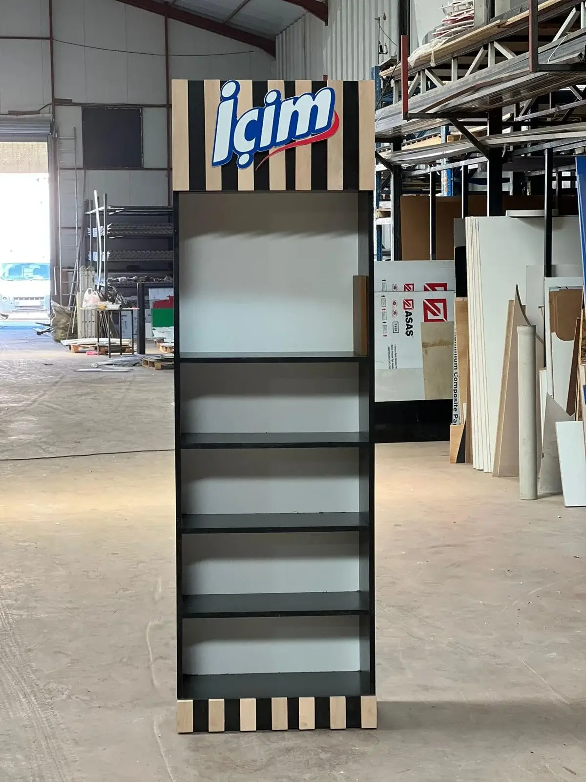 İçim Süt Ahşap Ürün Tanıtım Standı, market, mağaza ve satış noktalarında ürünlerinizi dikkat çekici şekilde sergilemek için tasarlanmış profesyonel bir teşhir çözümüdür. Dayanıklı ahşap gövdesi, marka baskılı yan panelleri ve sağlam raf yapısı sayesinde yüksek ağırlık taşıma kapasitesi sunar.